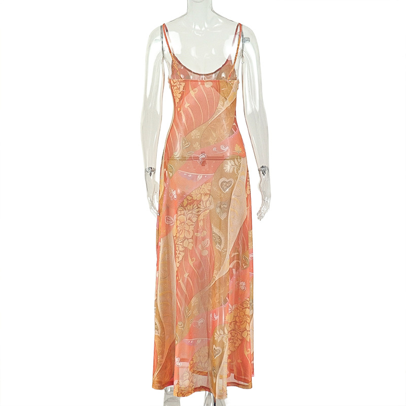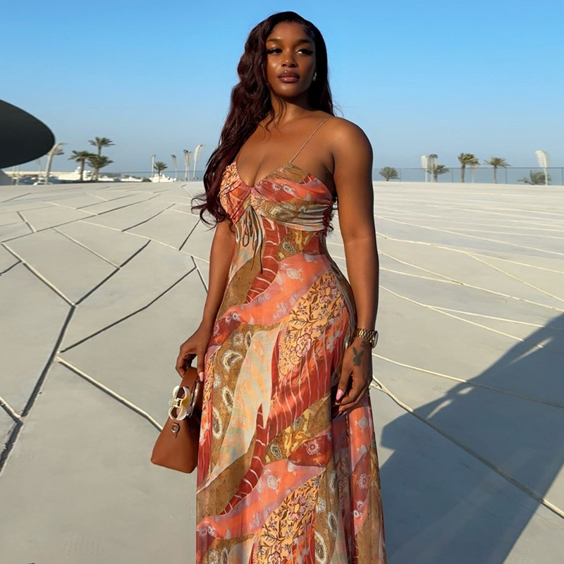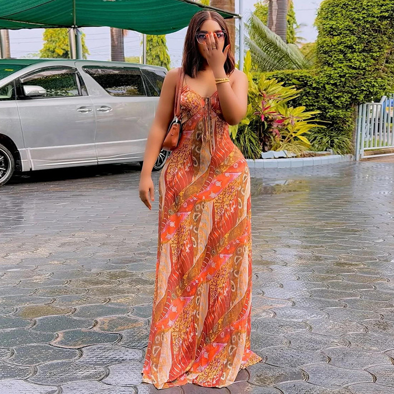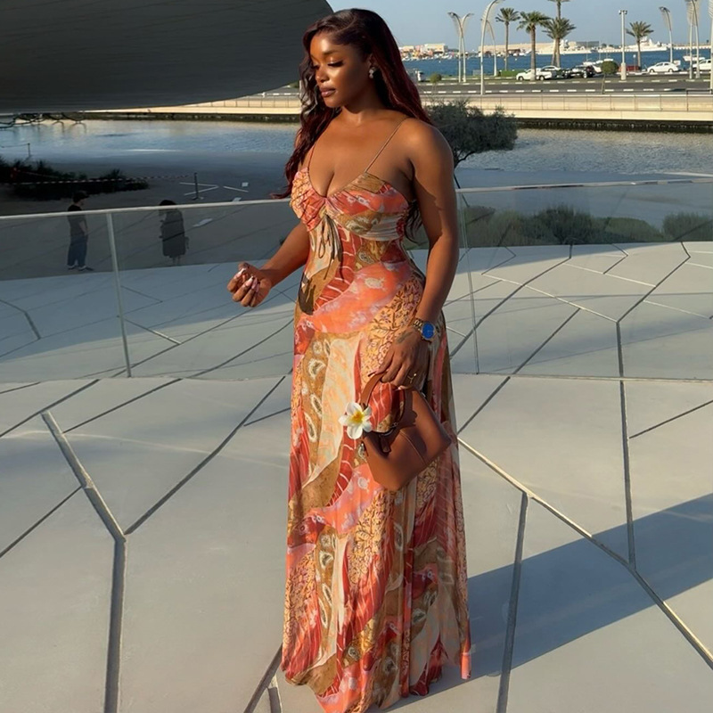 Printed Lightweight Women Sexy Backless Hip Dress Slim Strap Casual Holiday Maxi Dress